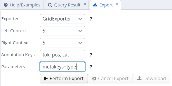 Meaning that the annotation cat="NP" applies to tokens 1-6 in the search result, and so on. Note that when specifying annotation layers, if the reserved name 'tok' is not specified, the tokens themselves will not be exported (annotations only).